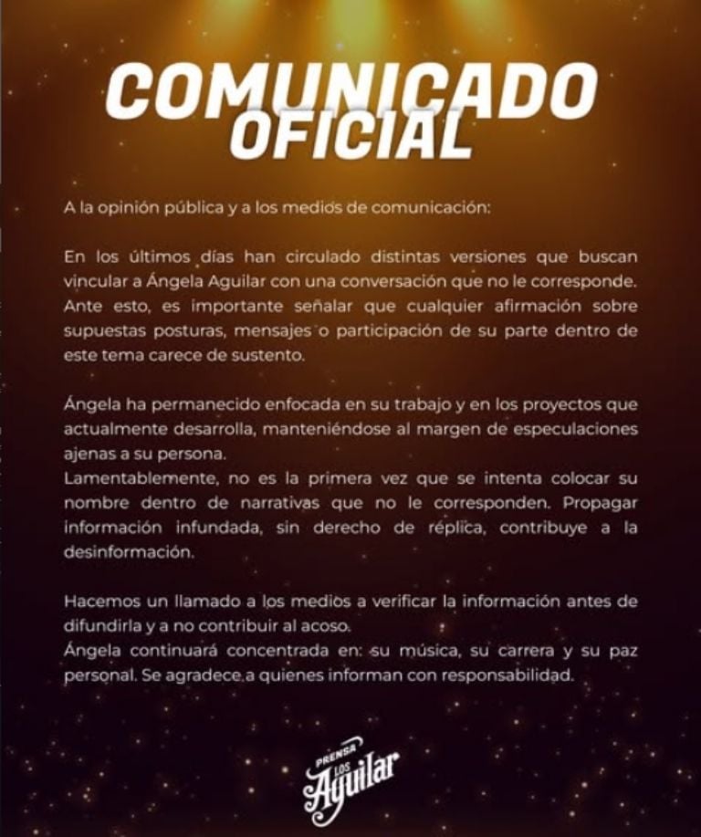«En los últimos días han circulado distintas versiones que buscan vincular a Ángela Aguilar con una conversación que no le corresponde… Ángela ha permanecido enfocada en su trabajo… Manteniéndose al margen de especulaciones ajenas a su persona», se lee en el comunicado.