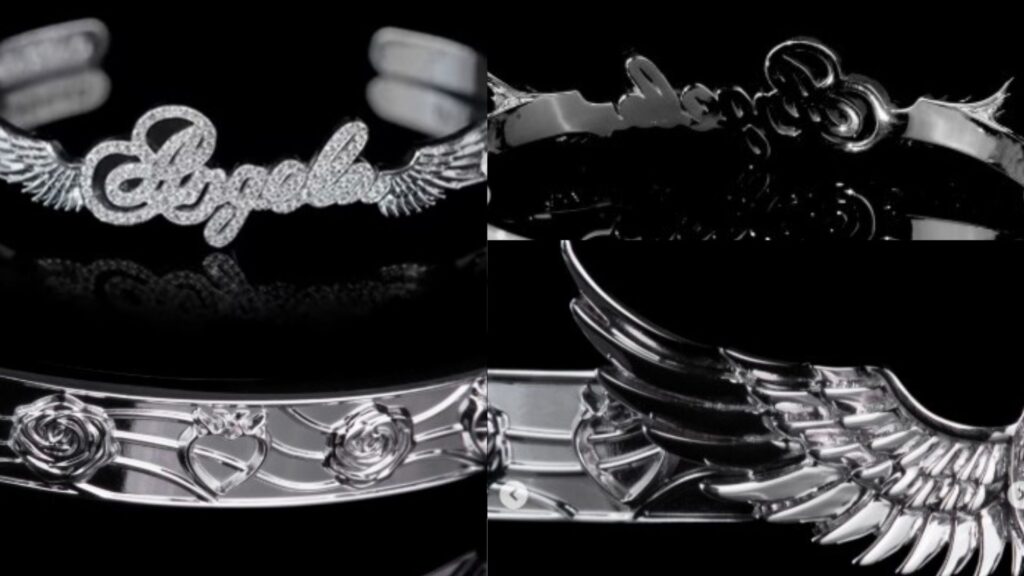 La pieza, elaborada por la joyería Braggao, fue descrita inicialmente como un brazalete de oro blanco cubierto de diamantes con el nombre “Ángela” enmarcado por detalles como alas de ángel, corazones en llamas y rosas entrelazadas, lo que reforzó aún más la creencia de que se trataba de un gesto romántico.
